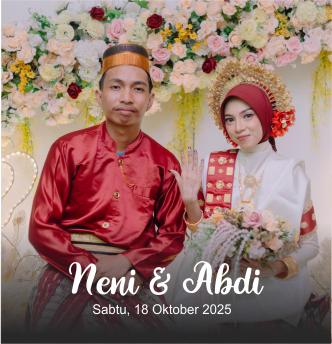 The Wedding of Neni & Abdi Sabtu, 18 Oktober 2025 00Hari 00Jam 00Menit 00Detik “Dan Diantara Tanda-tanda (Kebesaran) -Nya Ialah Dia Menciptakan Pasangan-pasangan Untukmu Dari Jenismu Sendiri, Agar Kamu Cenderung Dan Merasa Teteram Kepadanya, Dan Dia Menjadikan Diantaramu Rasa Kasih Dan Sayang. Sungguh, Pada Yang Demuikian Itu Benar-benar Terdapat Tanda-tanda (Kebesaran Allah) Bagi Kaum Yang […]