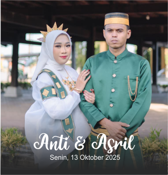 Anti & Asril Senin, 13 Oktober 2025 Save The Date “Dan di antara tanda-tanda (kebesaran)-Nya ialah Dia menciptakan pasangan-pasangan untukmu dari jenismu sendiri, agar kamu cenderung dan merasa tenteram kepadanya, dan Dia menjadikan di antaramu rasa kasih dan sayang. Sungguh, pada yang demikian itu benar-benar terdapat tanda-tanda (kebesaran Allah) bagi kaum yang berpikir.” Dengan memohon […]