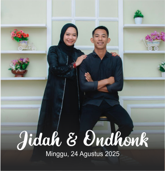 Undangan Cerita Kami Mempelai Galleri Kirim Doa & Ucapan The Wedding Of Jidah & Ondhonk 00Hari 00Jam 00Menit 00Detik Minggu, 24 Agustus 2025 “Dan di antara tanda-tanda (kebesaran)-Nya ialah Dia menciptakan pasangan-pasangan untukmu dari jenismu sendiri, agar kamu cenderung dan merasa tenteram kepadanya, dan Dia menjadikan di antaramu rasa kasih dan sayang. Sungguh, pada yang […]